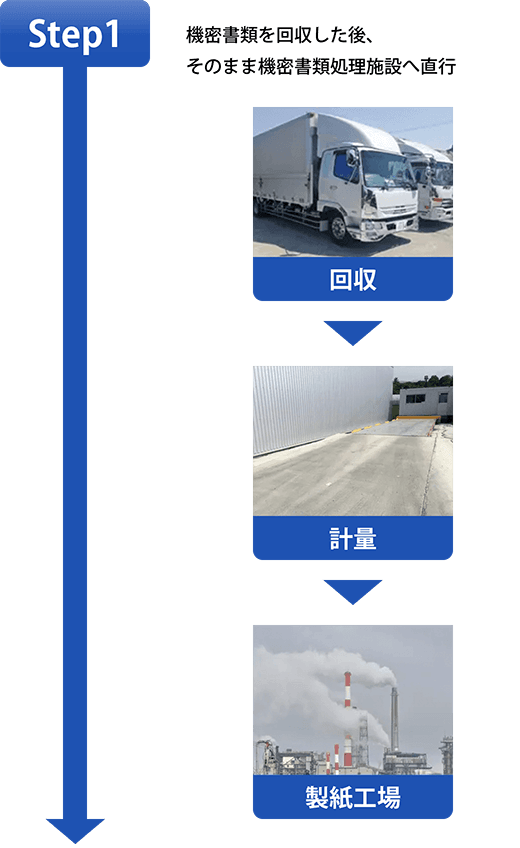お客様から排出された機密書類を回収した後、そのまま機密書類処理施設へ直行し、機密書類の入った段ボールを一切開封することなく、パルパー(溶解炉)へ投入し、溶解するサービスとなっております。