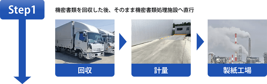 お客様から排出された機密書類を回収した後、そのまま機密書類処理施設へ直行し、機密書類の入った段ボールを一切開封することなく、パルパー(溶解炉)へ投入し、溶解するサービスとなっております。